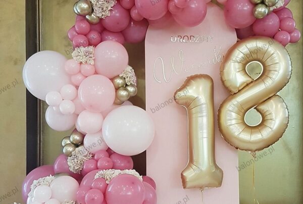 Organiczna dekoracja z hortensjami na 18 urodziny. Do dekoracji użyto 4 kolorów balonów: 004 Pink,…